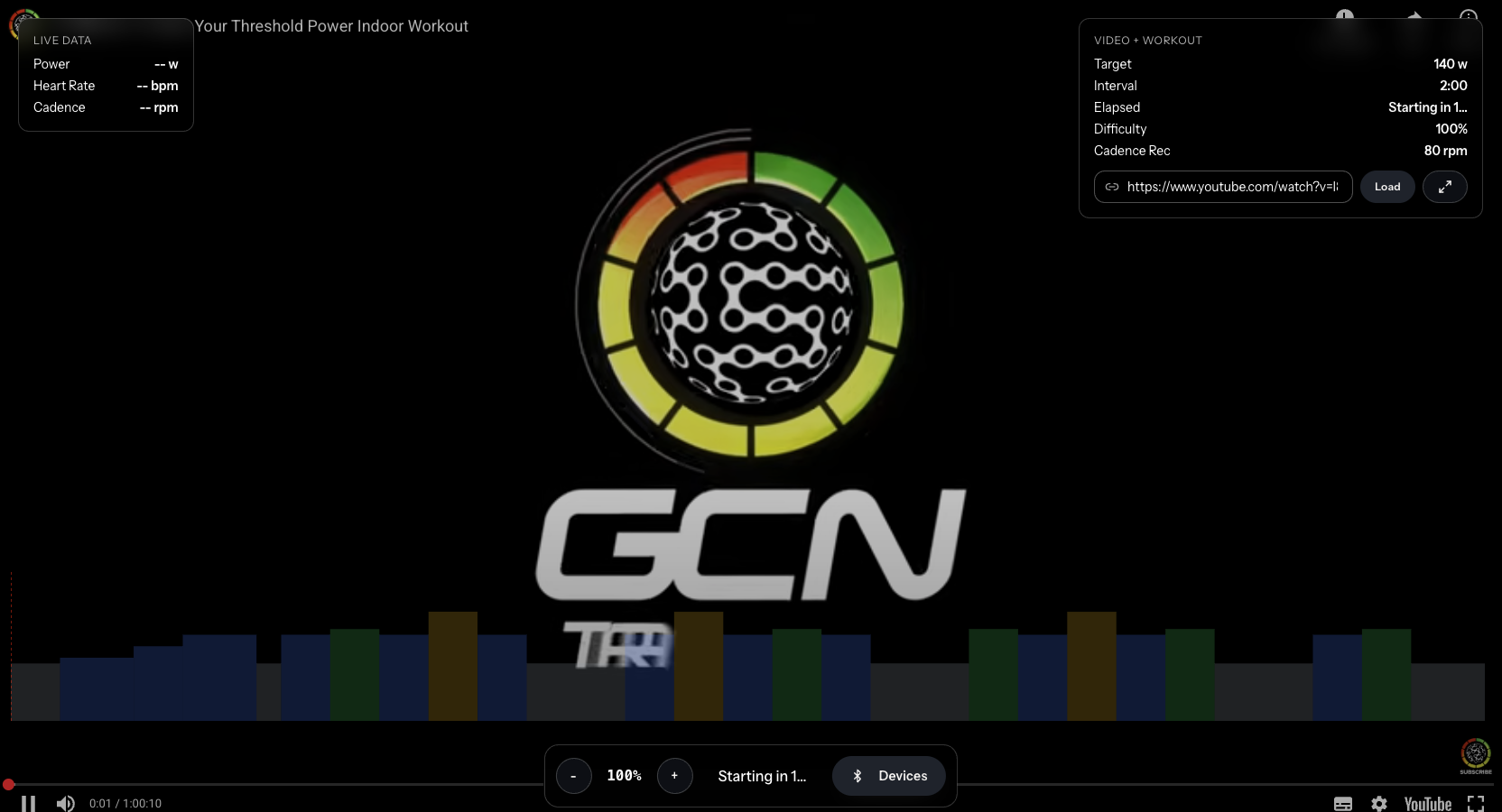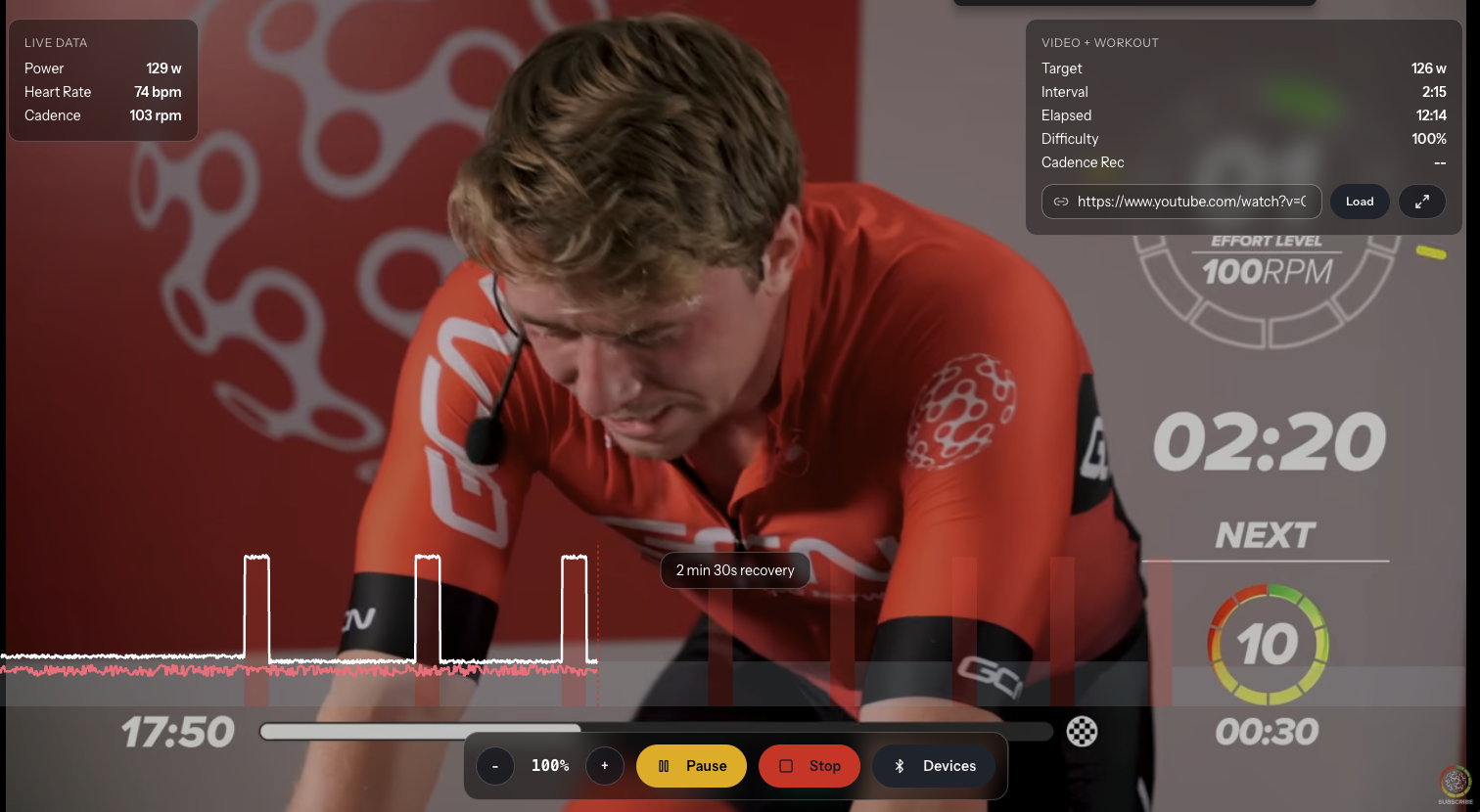 - Live data tracking (power, heart rate, cadence) overlaid on the workout graph