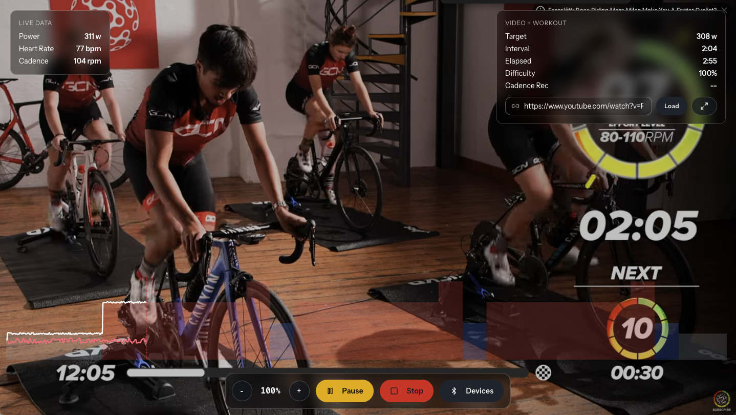 Video Workouts give you both: the motivation of guided video content and the precision of structured training. Ride along with the video while your trainer handles the intensity targets, and finish with real data that shows your progress.