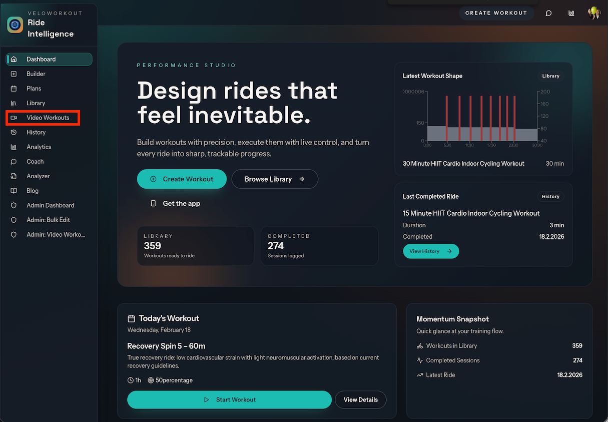- Open VeloWorkout and go to Video Workouts