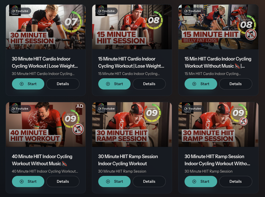 - Quality sessions: Pick interval-focused videos with clear work/rest periods